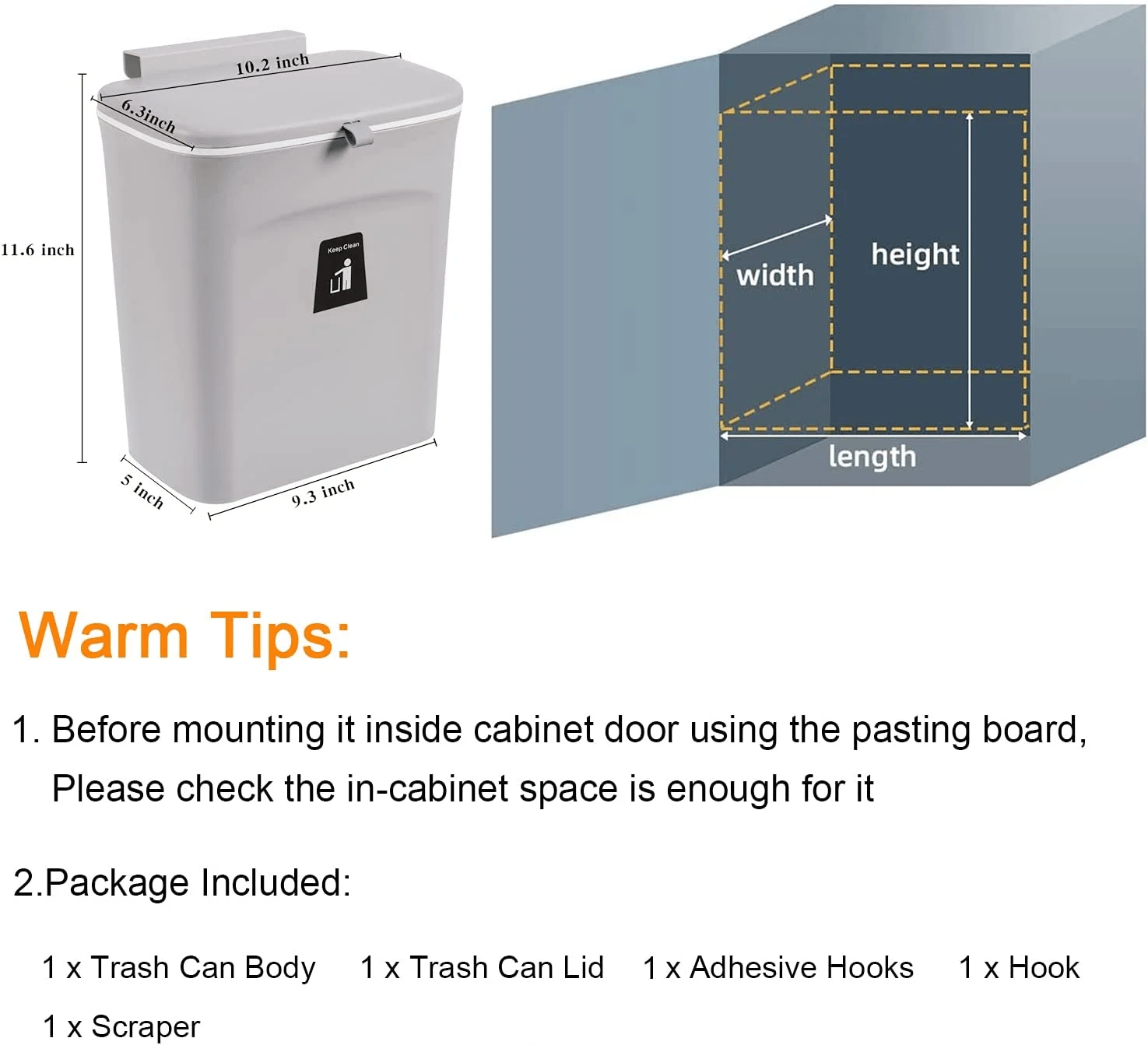 - 【WALL MOUNT/UNDER SINK TRASH CAN】: Trash bin is easy to install hanging, mount accessory ( 1 hook ) included. Small and perfect fit for most cabinet doors, pantry doors, cupboard; The thickness of the door should be less than 0.95 inch(2.5cm).